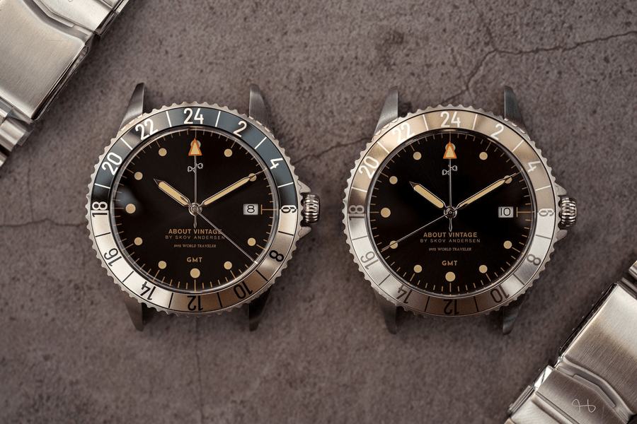 I 1982 GMT World Traveler har vi indrammet en vintage sjæl i moderne rammer - en dualitet, som gøres levende af en nostalgisk varme, skabt gennem markørens gyldne toner og farvepalettens tidløse simplicitet. Begge editions har en 60-klik retningsbestemt krans, som er lavet af poleret anodiseret aluminum; den ene med en mørkeblå halvdel for at symbolisere aftentimer og råhvid for dagtimer på GMT-funktionen. Den anden edition fremhæver aftentimerne gennem en varm grå halvdel mens en kølig grå halvdel sørger for dagtimerne