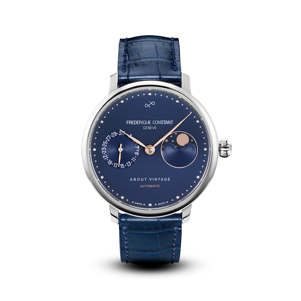 Dybblåkurvet skive med stål indeks-markeringer og rosaguld visere.Månefase ud for ’3’ og dato ud for ’9’.