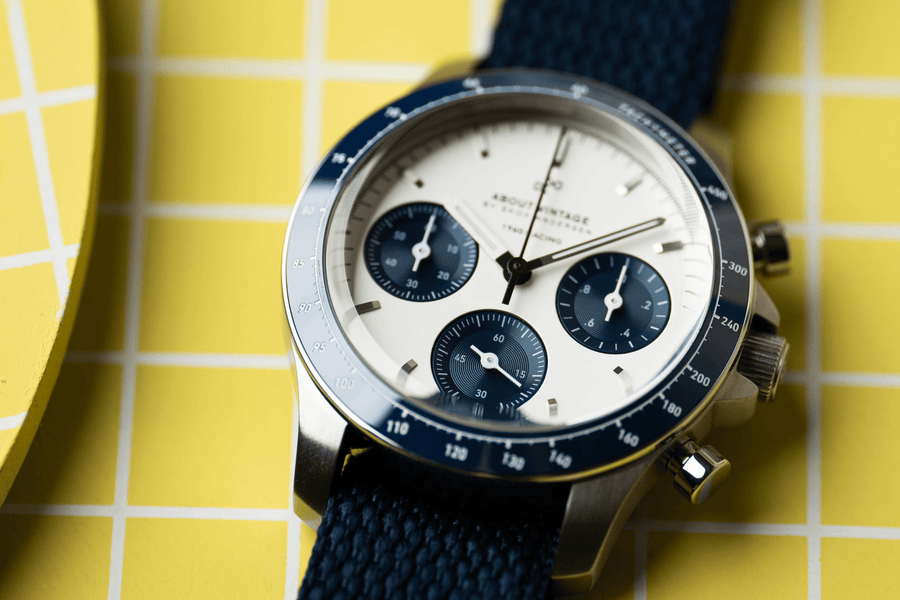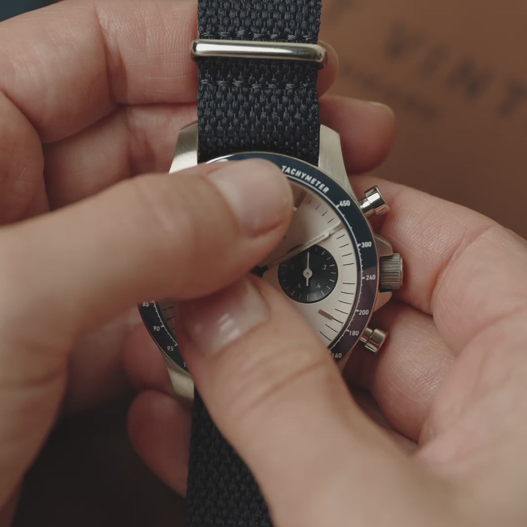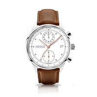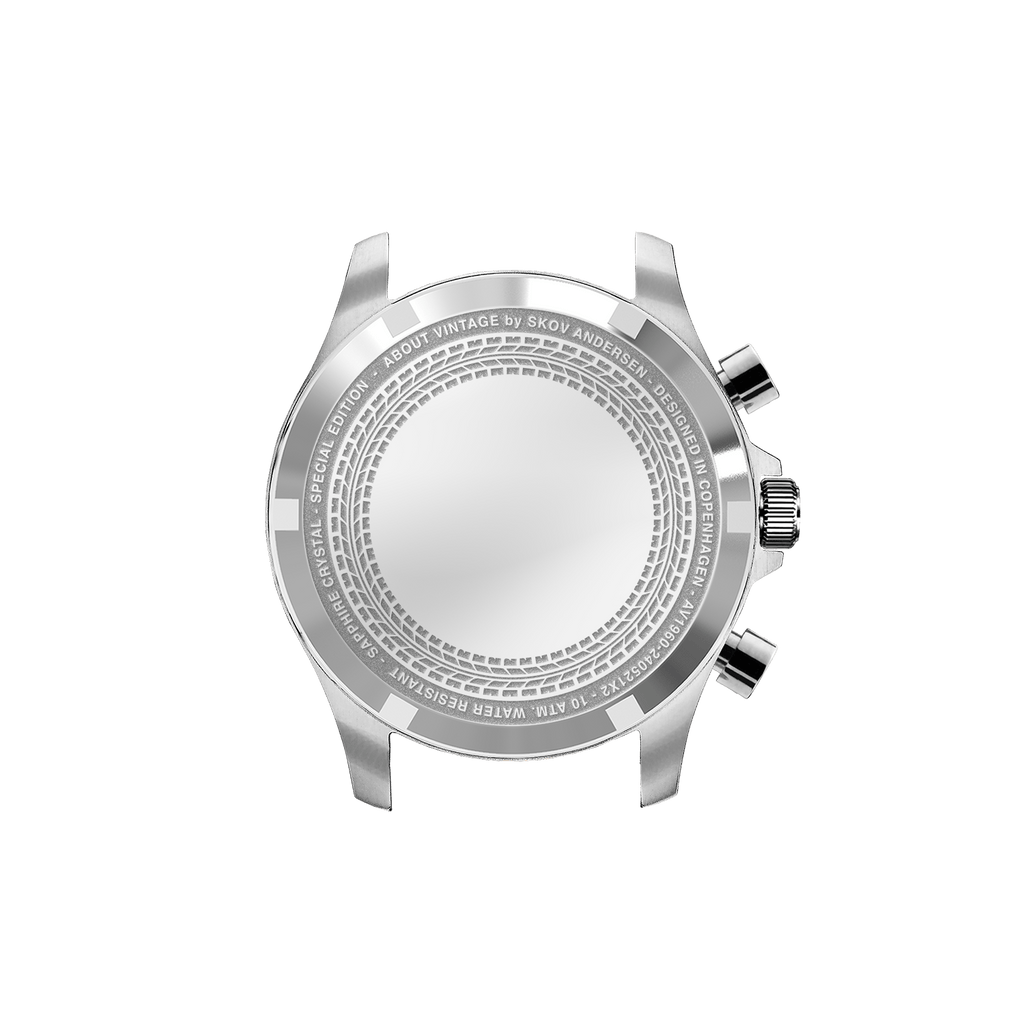 Designet balanceres af æstetiske vintage detaljer, 80’ernes Bauhaus linjer og moderne teknologi, der går op i en højere enhed i en 40mm sports chronograph komplet med tachymeter, ridsefrit safir krystalglas med anti-refleksiv overflade og 316L kirurgisk stål urkasse.