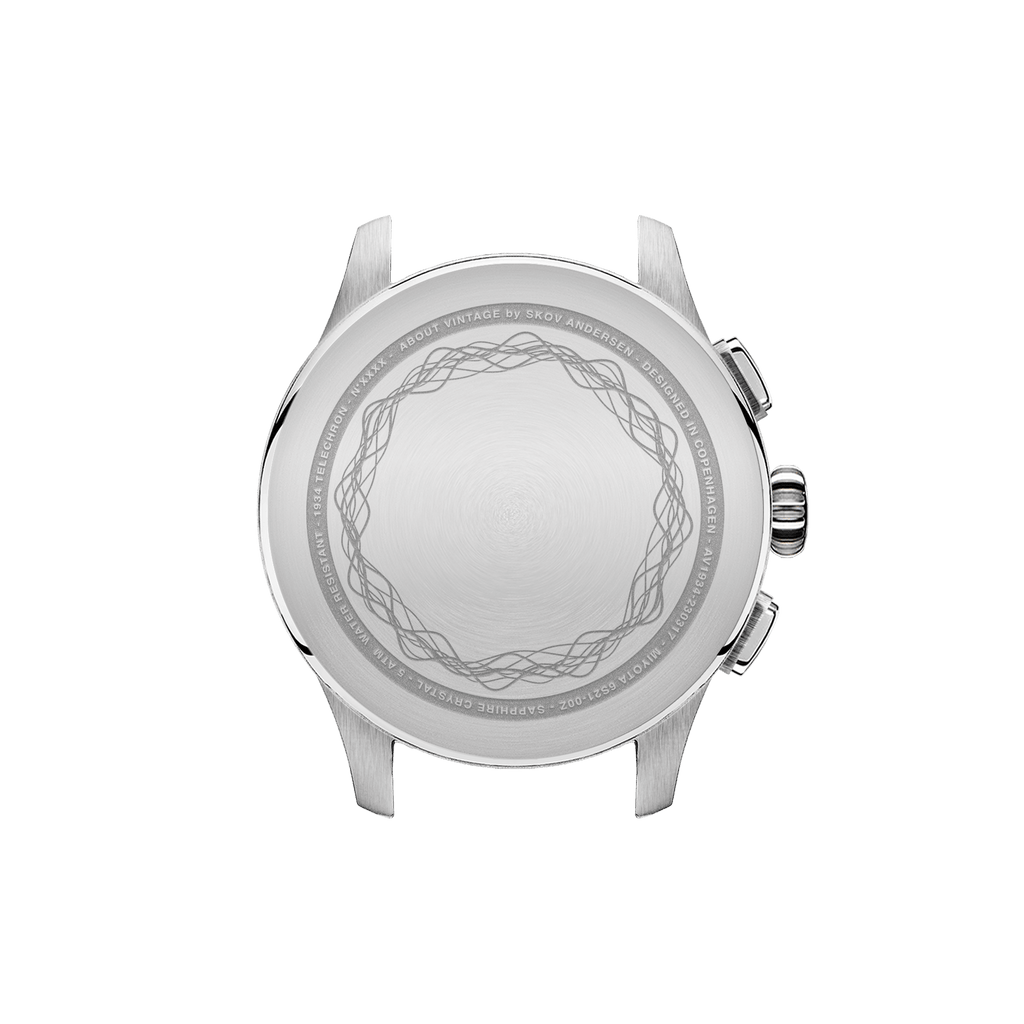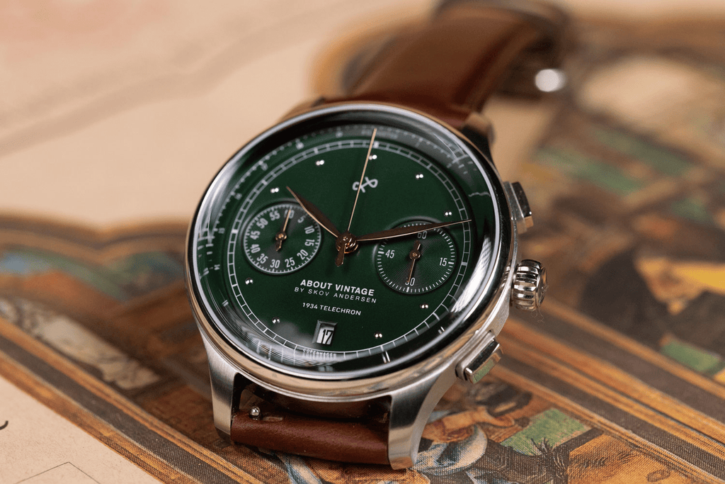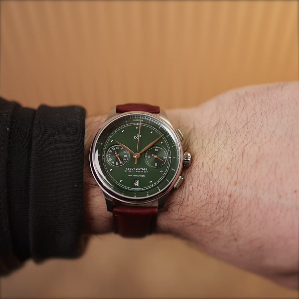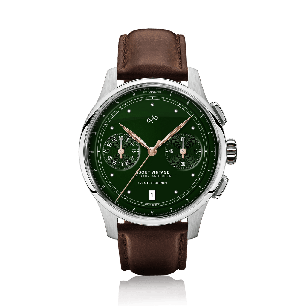 Telechron er også 2.0-kronografen fra About Vintage, med en telemeterskala til måling af afstanden af lyd, samt dato- og stopursfunktioner.