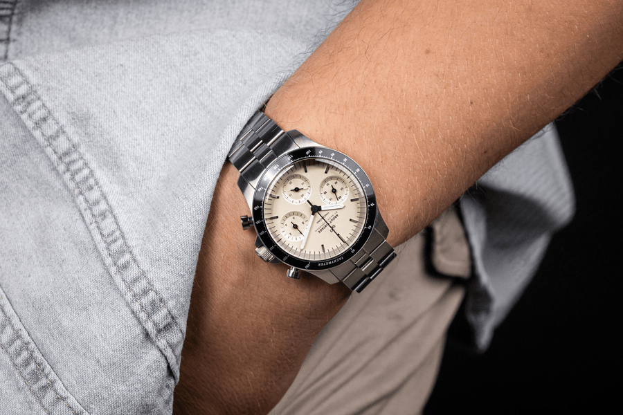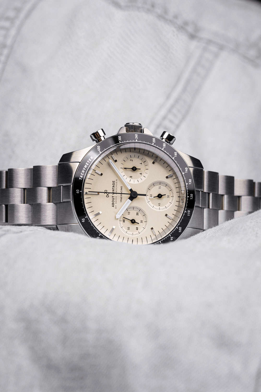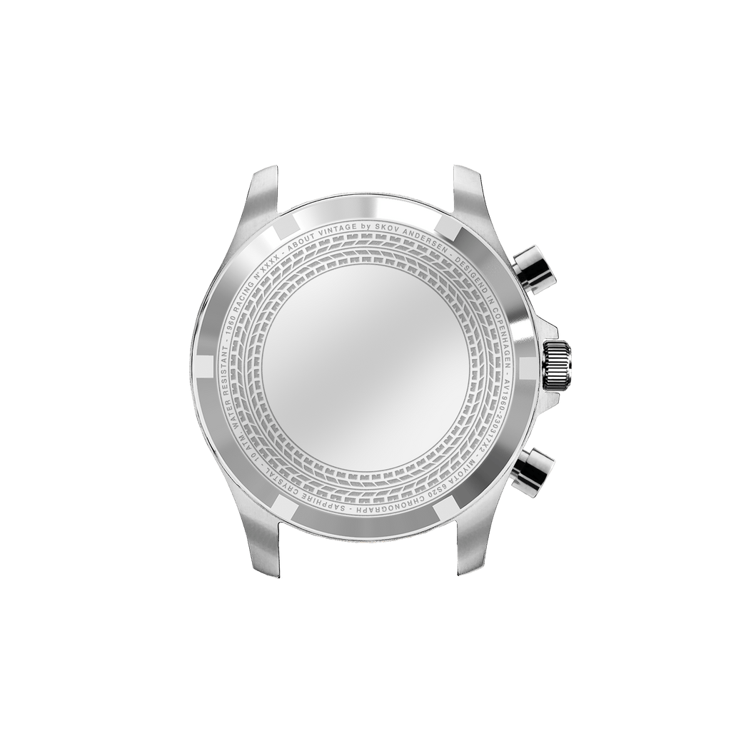 Designet balanceres af æstetiske vintage detaljer, 80’ernes Bauhaus linjer og moderne teknologi, der går op i en højere enhed i en 40mm sports chronograph komplet med tachymeter, ridsefrit safir krystalglas med anti-refleksiv overflade og 316L kirurgisk stål urkasse