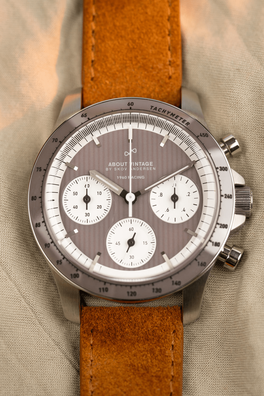 1960 er et kronografur med alle de fordele, den type ur tilbyder. Det er udstyret med tre sub dials, der viser tyvendedele sekunder for nøjagtig timing af racerbane-omgange til højre, minutter til venstre og løbende sekunder i midten. Uret er drevet af et japansk fremstillet Miyota-urværk, der er bredt kendt for deres holdbarhed og pålidelighed.