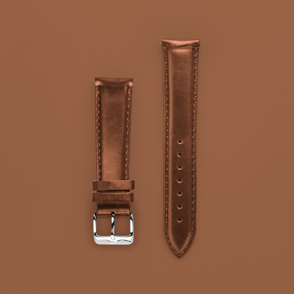 Todelt rem lavet af italiensk læder med About Vintage indgraveret på indersiden af remmen. Pin spænde i stål, guld eller rosaguld (coating) med indgraveret signatur logo.