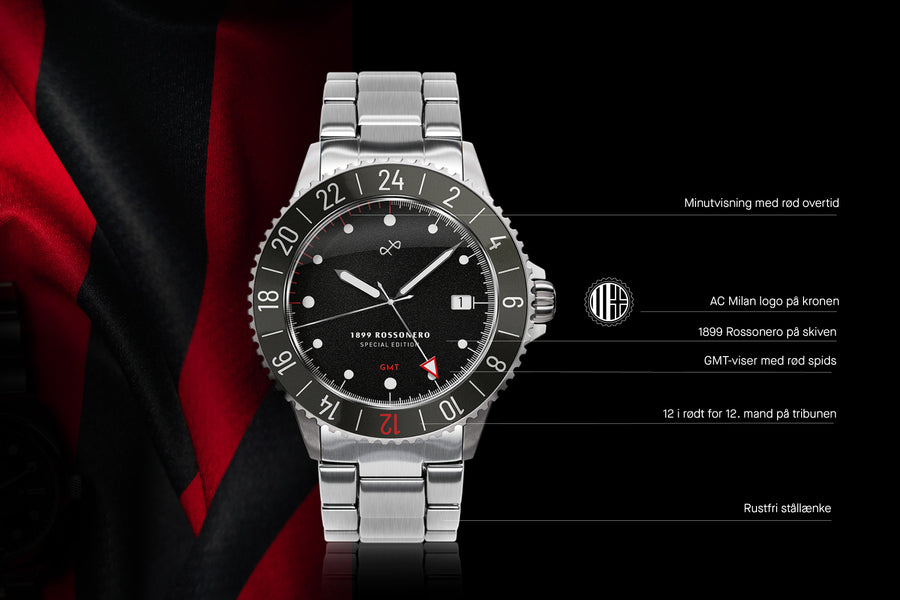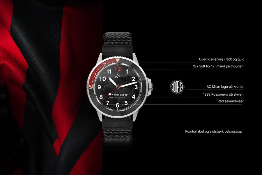 Vi er stolte af at introducere den ultimative AC Milan Familie Kollektion, bestående af tre ure - et GMT, et Chronograph og et Børneur - hver med et unikt stykke af spillertrøje i bagkassen og individuelt nummereret.