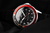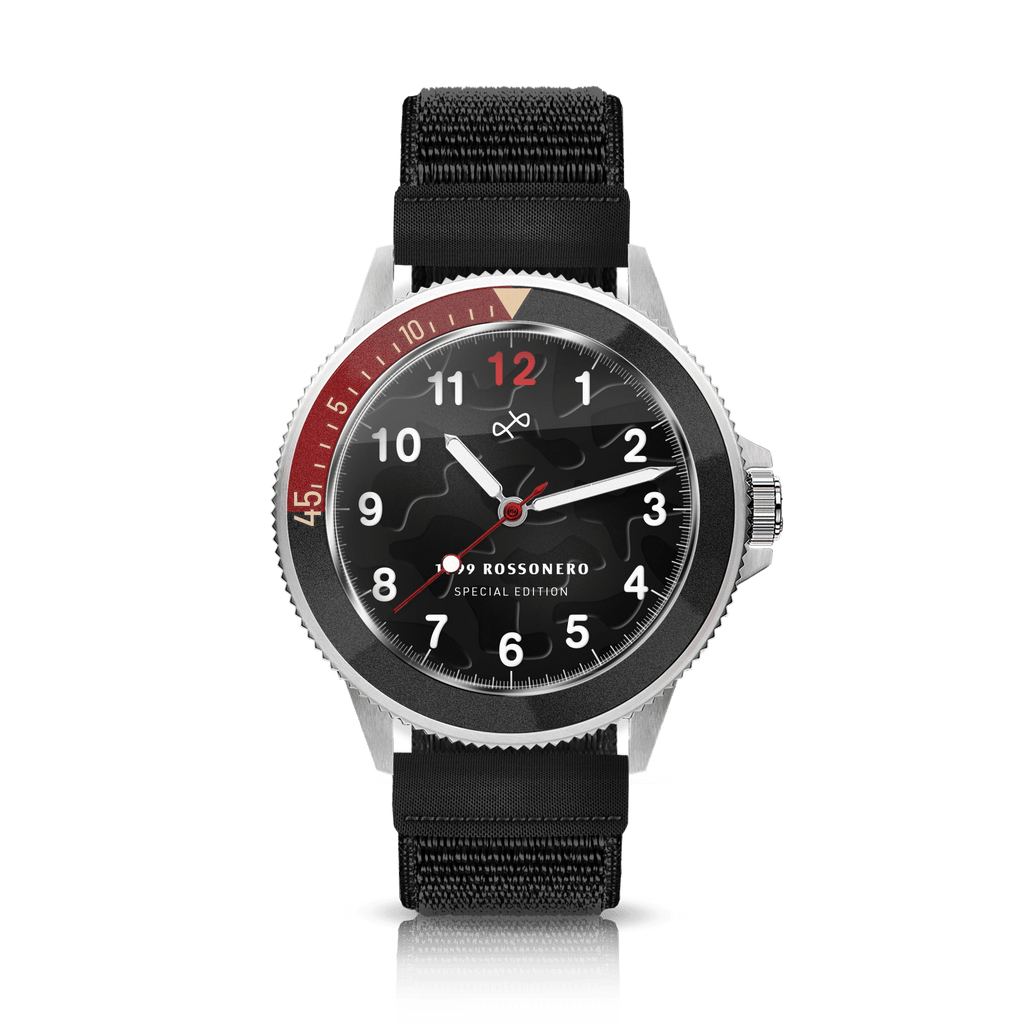 Embossed black dial and matt black and red bezel with gold details
