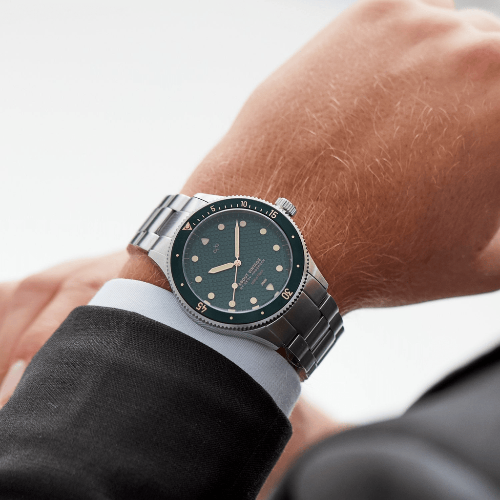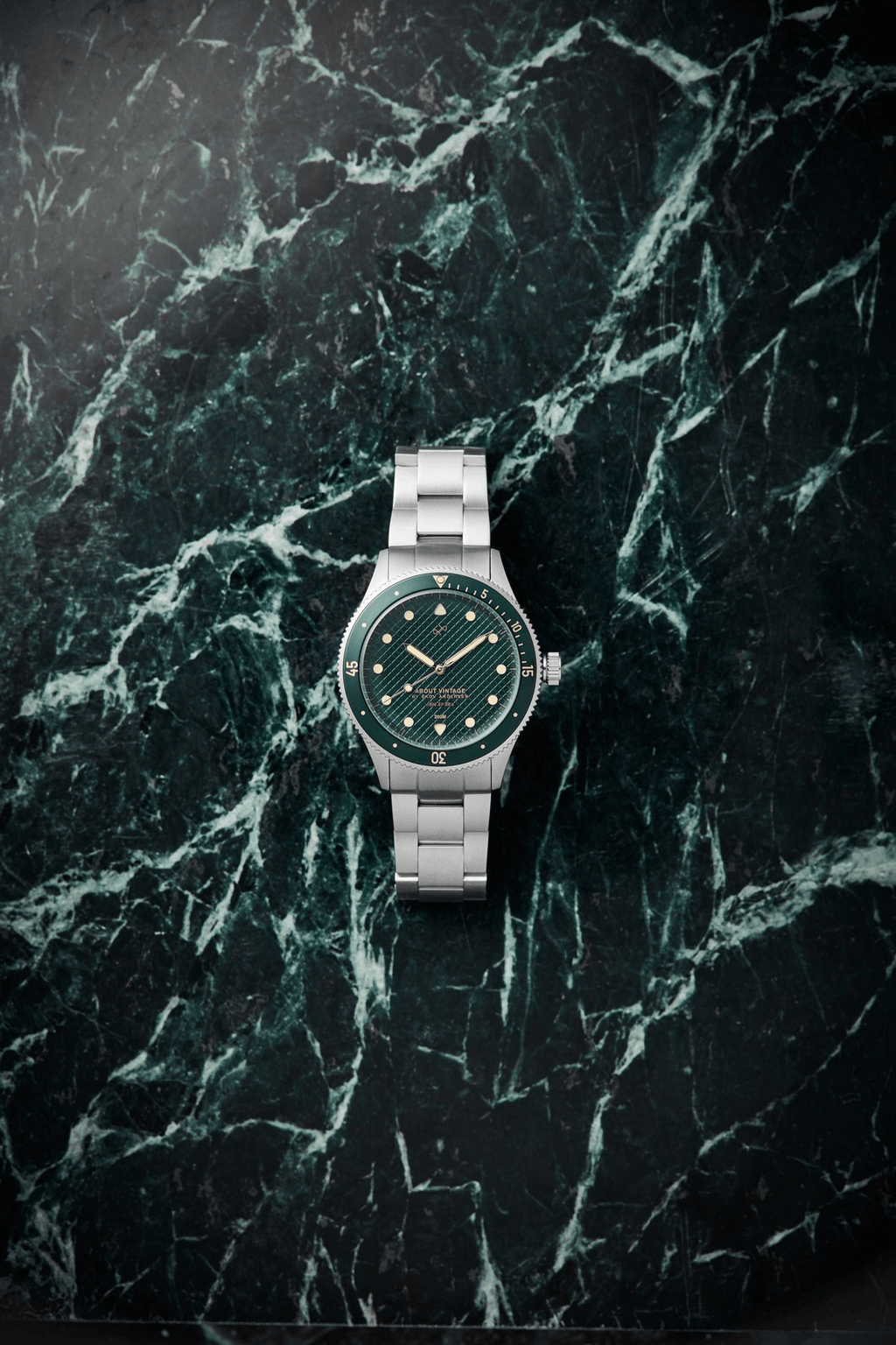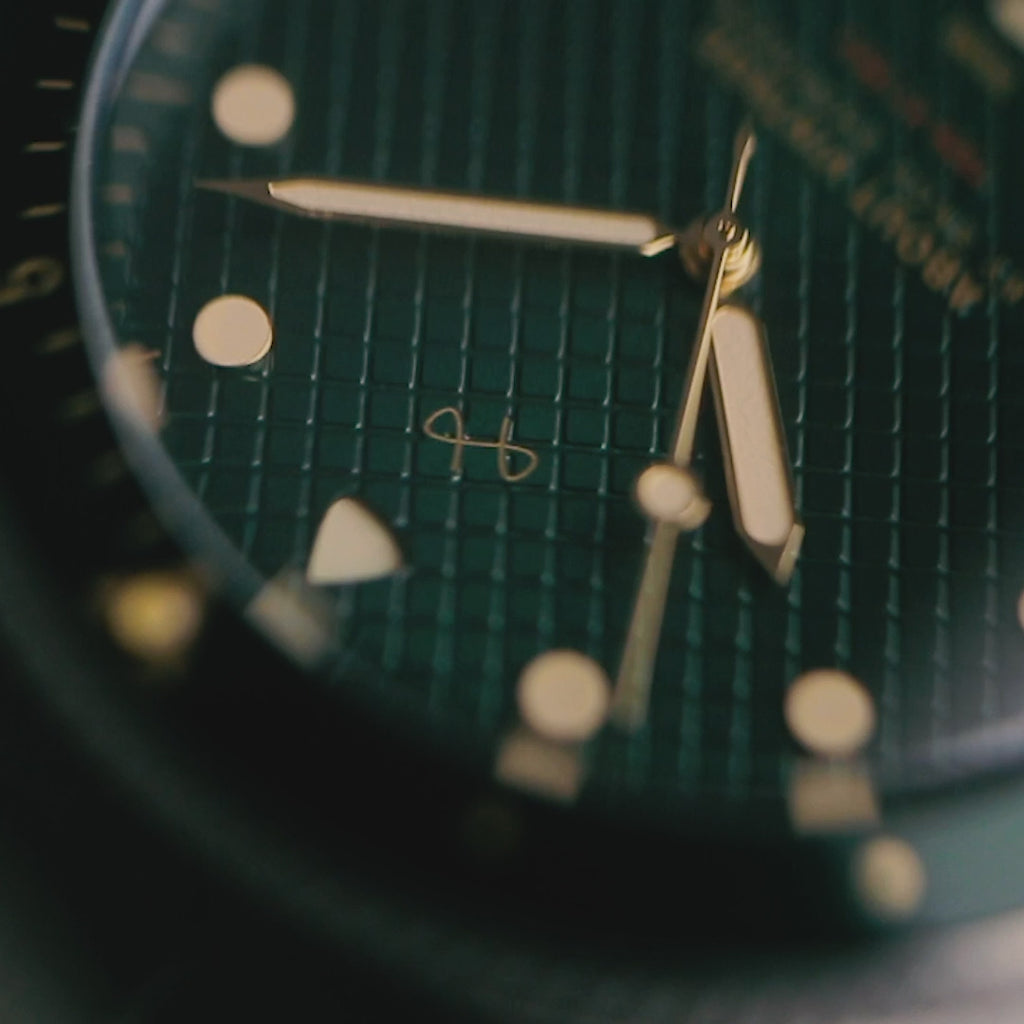 En urskive med tekstur er en klassiker inden for ure. Det giver et ekstra lag til urskiven og et lækkert spil, når lys rammer mønsteret. På vores Turtle-skiver har vi valgt et traditionelt Tapisserie-mønster, der minder om et skjold, og roteret det 45 grader for at give det et moderne twist.