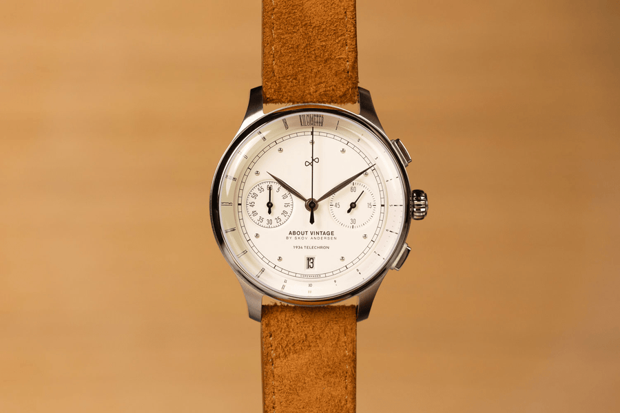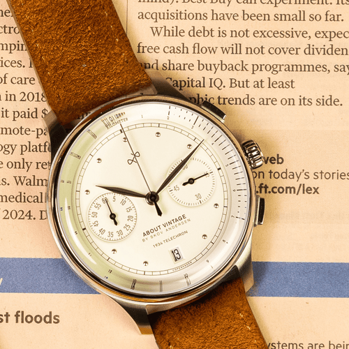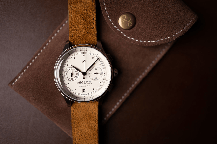 Telechron er også 2.0-kronografen fra About Vintage, med en telemeterskala til måling af afstanden af lyd, samt dato- og stopursfunktioner.