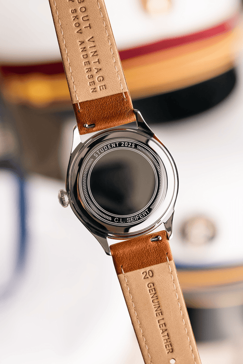 CL Seifert TwentyFive er skabt som en hyldest til studenterne i 2025. I samarbejde med CL Seifert har About Vintage designet et ur, der kombinerer tidløst håndværk med symbolske detaljer fra studentertiden. Uret er baseret på det klassiske 1968-design, men med unikke tilføjelser, der gør det helt særligt for årets studenter.