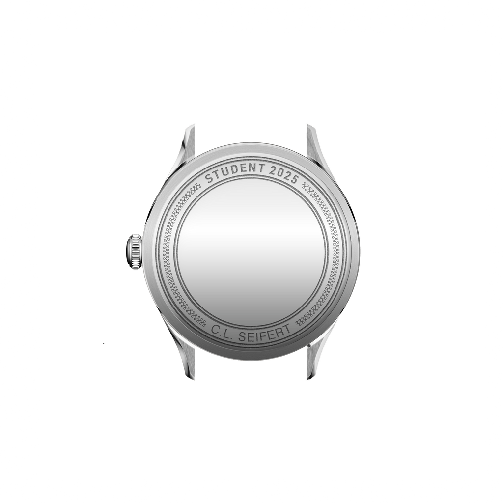 Ingen studenterhue er komplet uden personlige minder skrevet på indersiden – og det samme gælder for CL Seifert TwentyFive. Bagkassen på uret er indgraveret med teksten “STUDENT 2025”, men har også et område dedikeret til din egen personlige tekst. Her kan du tilføje dit navn, datoen for din eksamen eller måske et særligt citat, der indrammer netop din studentertid.