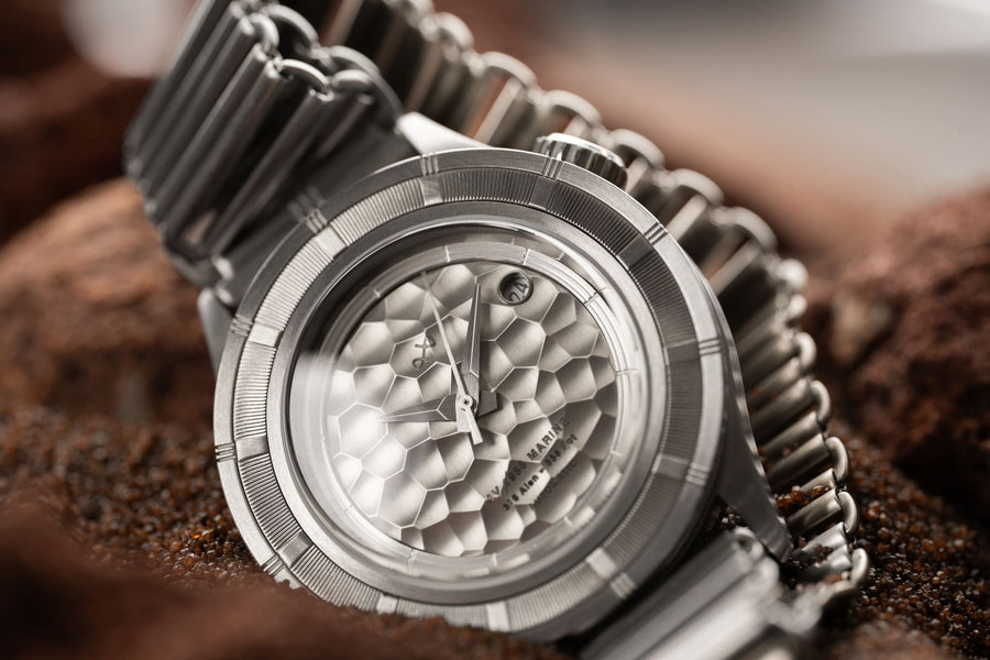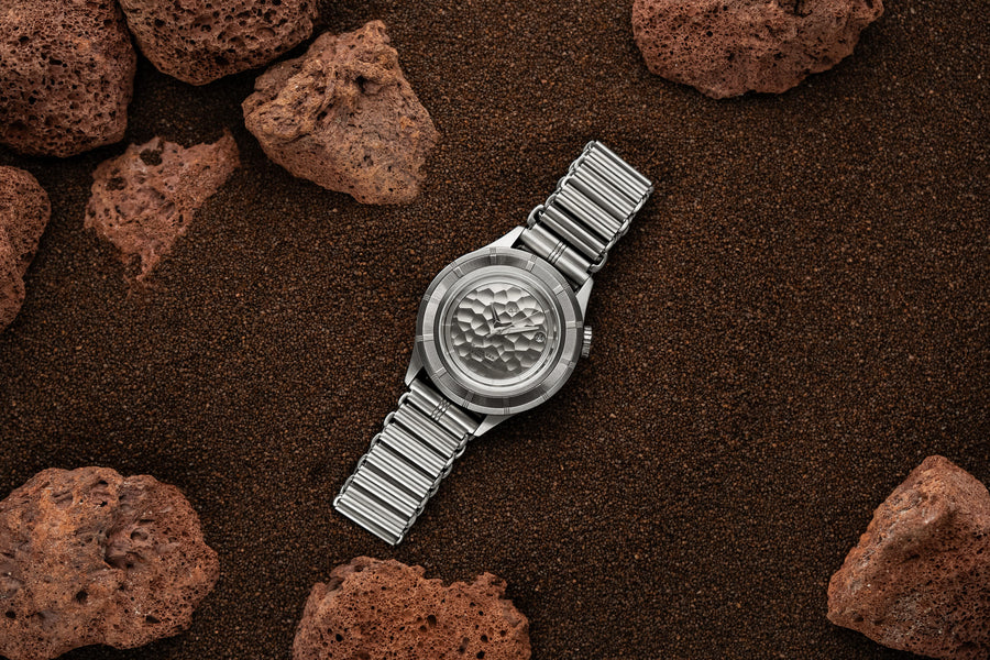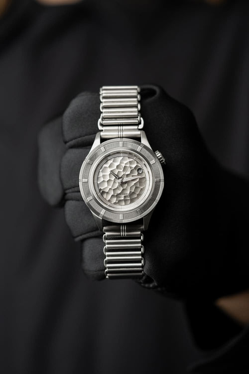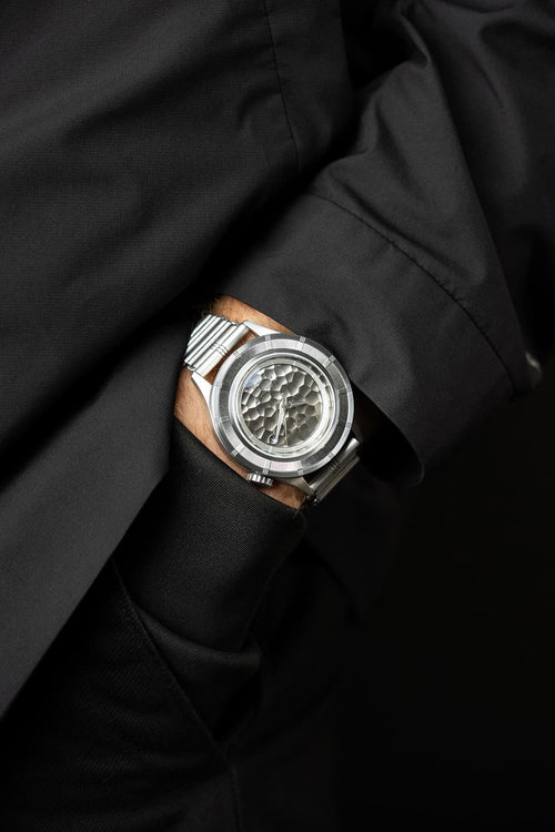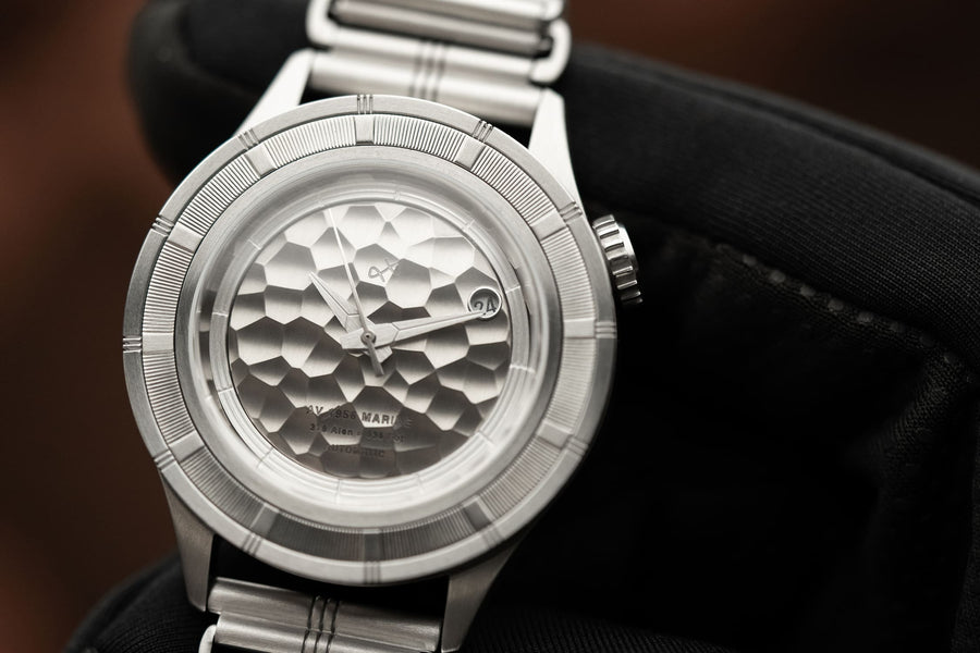 Hammered vertical brushed dial and brushed steel hands