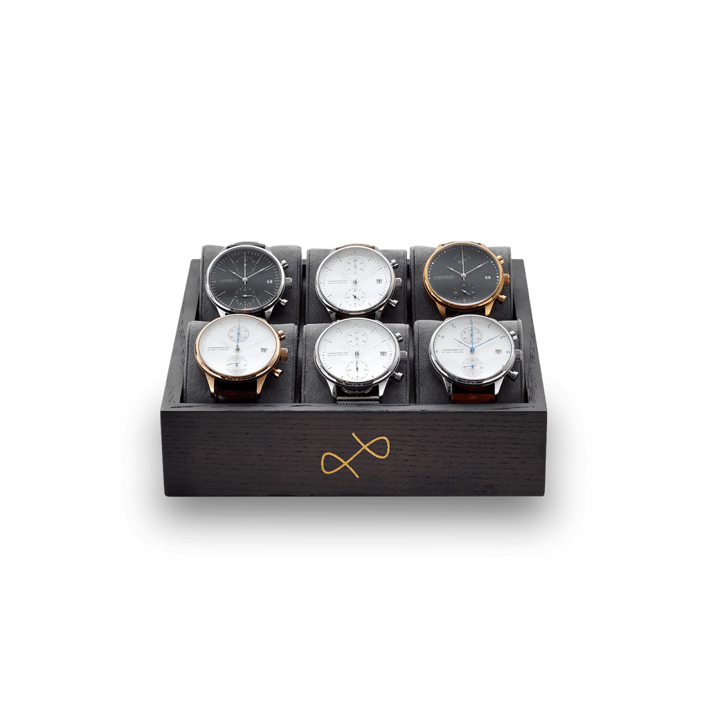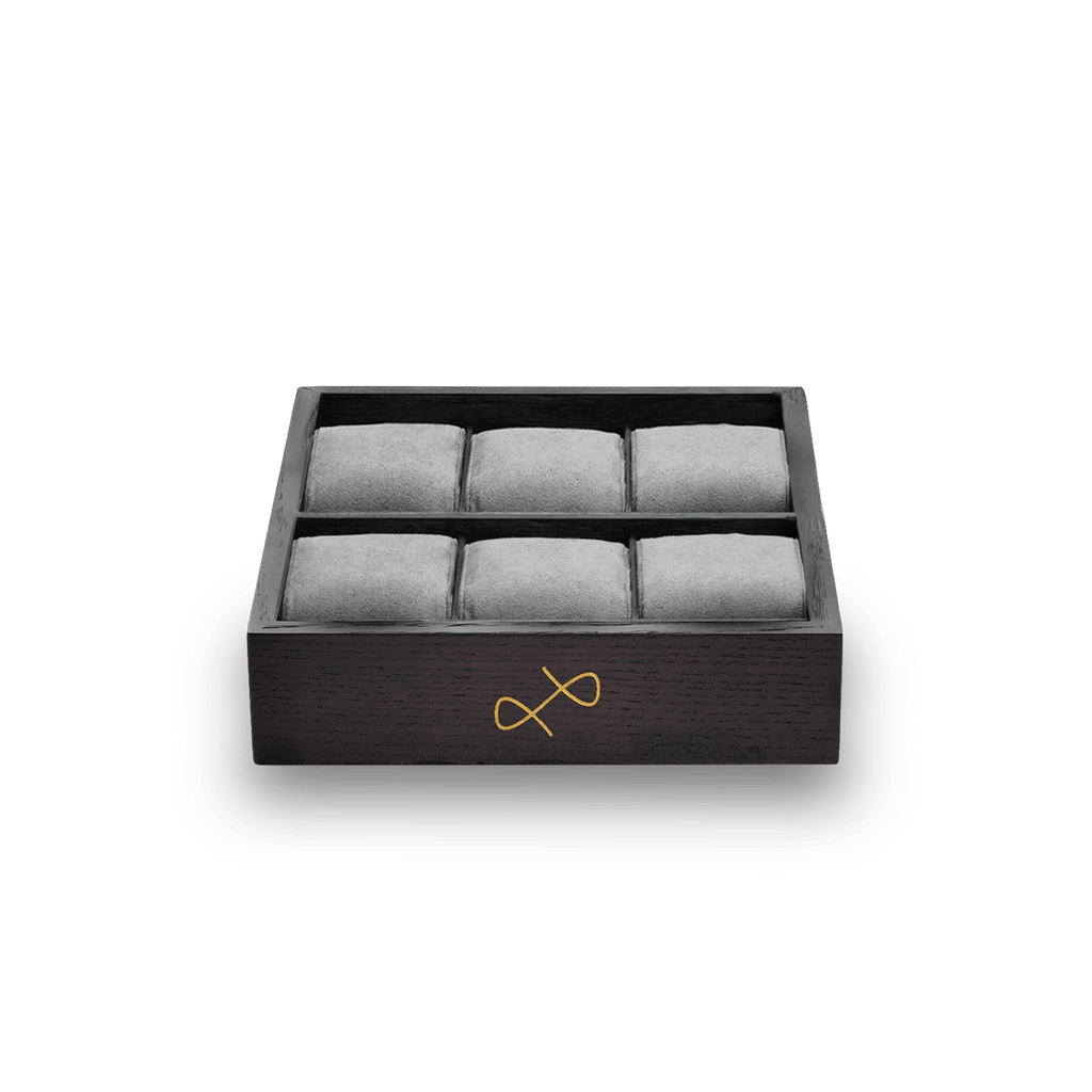 About Vintage kollektionsboks i røget eg med messing farvet logo, inkl. 6 grå ruskindspuder til at holde dine ure. Perfekt til at udstille din kollektion eller organisere dine ure med stil i din skuffe.