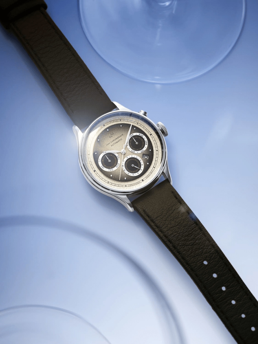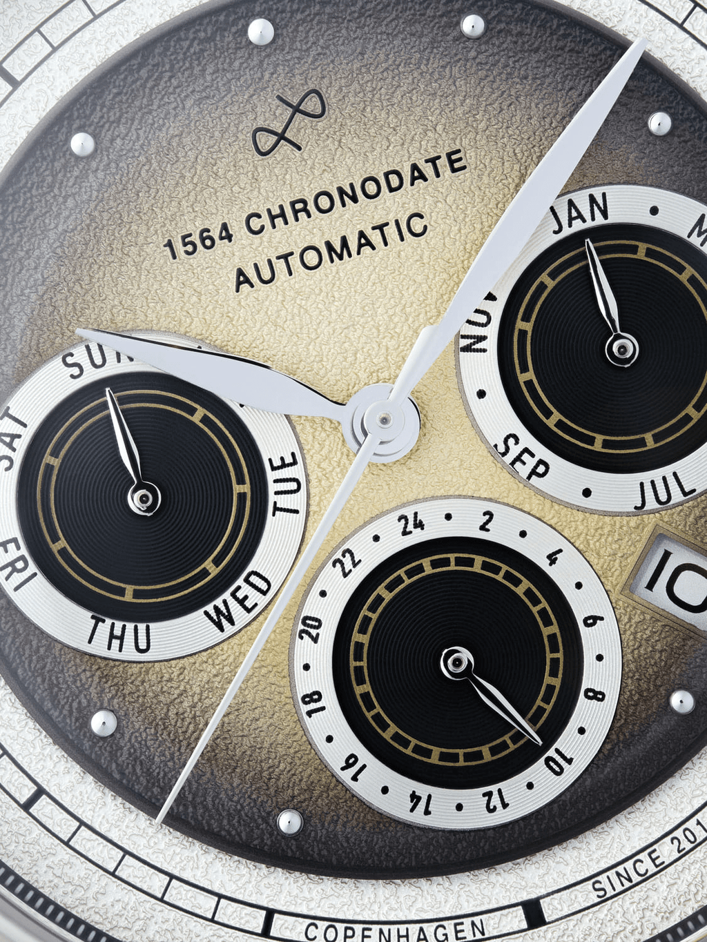 1564 Automatic Chronodate fejrer vores første årti som urbrand. Designet balancerer vintage og moderne elementer, så det både hylder vores historie og ser fremad. Urkassen kombinerer polerede og børstede overflader, der fremhæver dens kurver og lagdelte struktur.